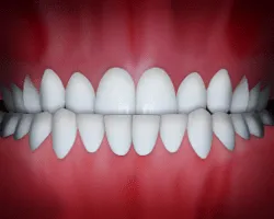 The upper front teeth extend too far out over the lower front teeth, sometimes causing the lower front teeth to bite into the roof of the mouth. Problems often associated with an overbite include a “gummy” smile, protruding lips, and excessive incisor wear.